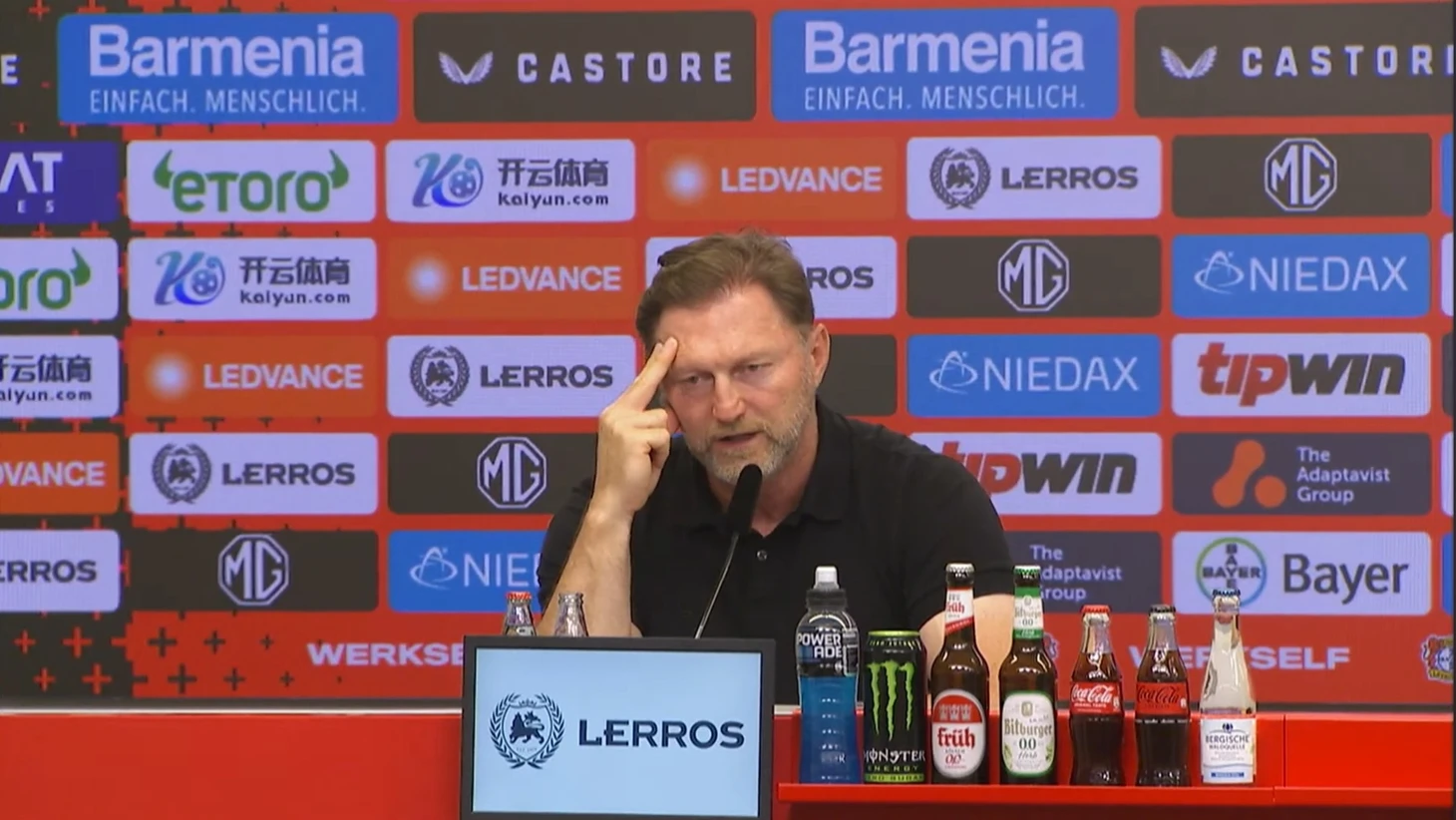 «Добрый вечер! Поздравляю Хаби Алонсо с тремя очками. Я думаю, что обязательно нужно поздравить и зрителей, потому что сегодня они увидели очень классный матч, в котором был возможен любой результат. Когда твоя команда забивает три гола в Леверкузене, и этого всё равно недостаточно для победы, то это тяжело и болезненно сказывается на игроках. Они сильно огорчаются. Сегодня мы не были достаточно хороши в обороне и особенно на стандартных положениях против такой активной игры в атаке и динамики со стороны «Байера».