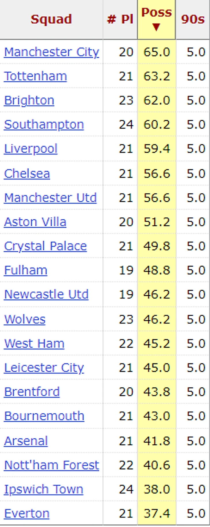 В АПЛ позади пять туров и именно эти пять команд − «Эвертон», «Ипсвич», «Ноттингем Форест», «Арсенал» и «Борнмут» − заняли последние строки по владению мячом.