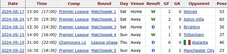 Как можно видеть на другой таблице, довольно сильно статистику «Арсенала» подпортила игра с «Манчестер Сити». Правда, и в матчах с «Брайтоном» и «Тоттенхэмом» команда Артета предпочитала меньше проводить времени с мячом − всего 36% и 37%.