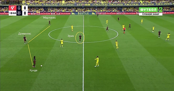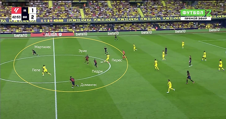 Без мяча «Вильярреал» действовал по привычной для себя схеме 4-4-2. В такой конфигурации пара нападающих Пепе-Перес зачастую перекрывала направление передачи на Эрика Гарсию – это осложняло процесс выхода из обороны в атаку для «Барселоны».