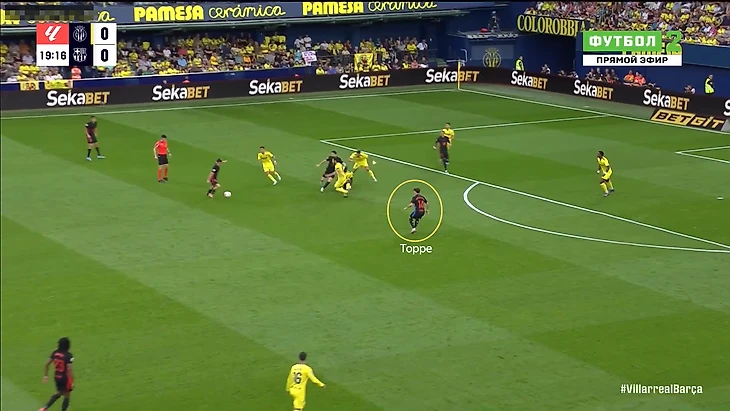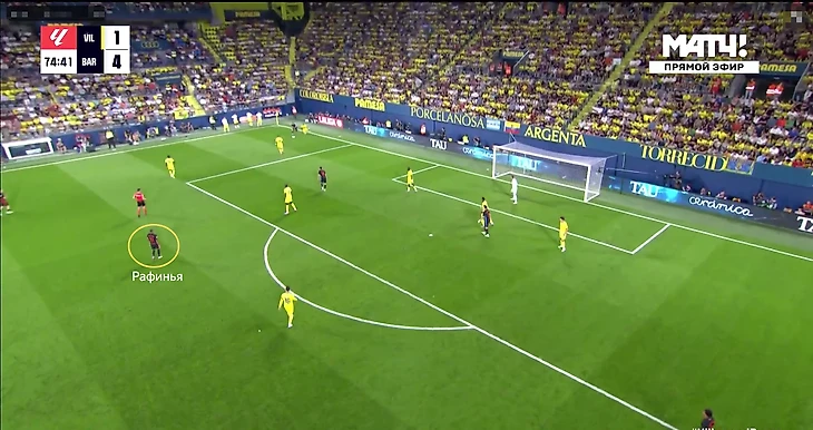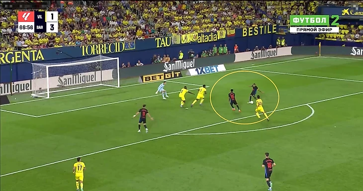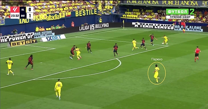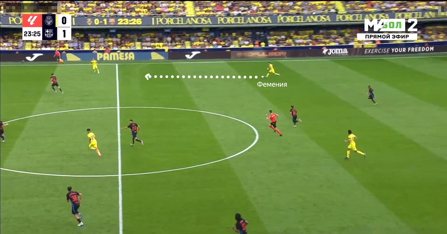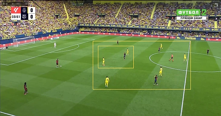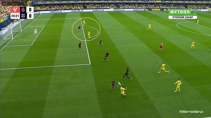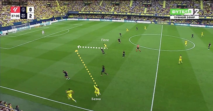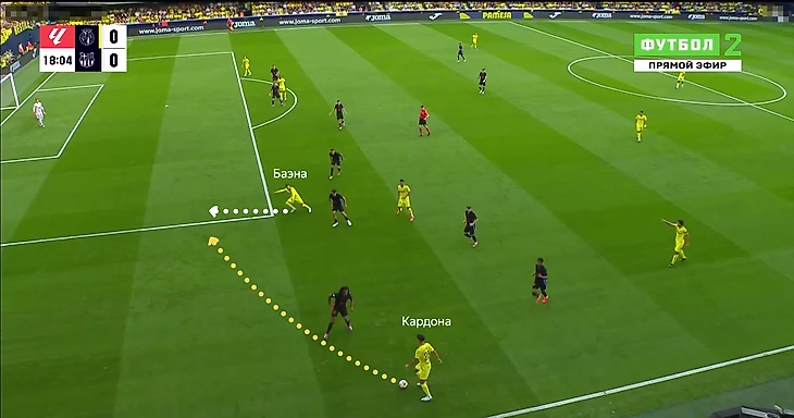 Это осложняло «Вильярреалу» процесс построения атак, а также служило дополнительным источником моментов после высоких возвратов мяча. Как, например, здесь.