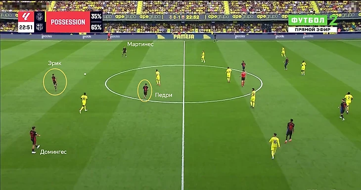 В опорной зоне с первых минут снова вышел Эрик Гарсия. Каталонец занимал самую глубокую позицию. Выше со свободой перемещений действовали Рафинья, Педри и Торре.