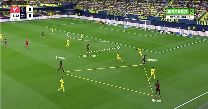 В результате на этом фланге зачастую создается много опасности. Первый вариант – комбинации с кем-то третьим, когда к Кунде и Ямалю подключается кто-то из полузащитников. Например, здесь Педри. Во-первых, «Барса» получает возможность обострять за счет комбинаций этого треугольника. Во-вторых, таком образом каталонцы вытягивают соперника и создают пространство в штрафной для рывков партнеров (в данном случае – для Левандовского).