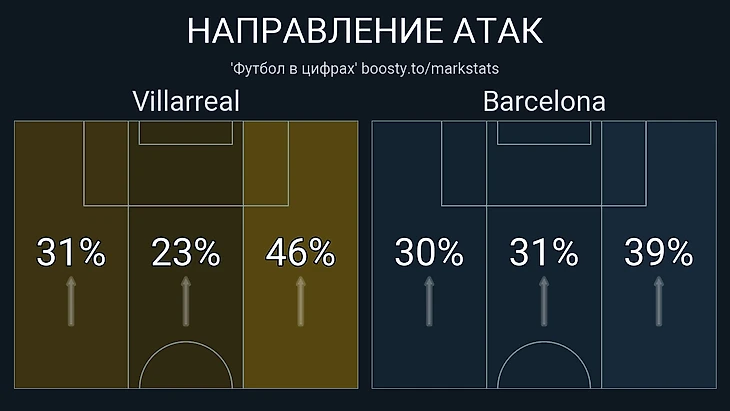Здесь по счету все было более однозначным. При этом по самой игре «Вильярреал» не был настолько плох. Команда Марселино могла забивать больше, так как острота была в обе стороны: 4 – 8 по явным голевым моментам и 2.07 – 3.6 по ожидаемым голам в пользу «Барселоны». Давайте разбираться в причинах такого яркого игрового рисунка.