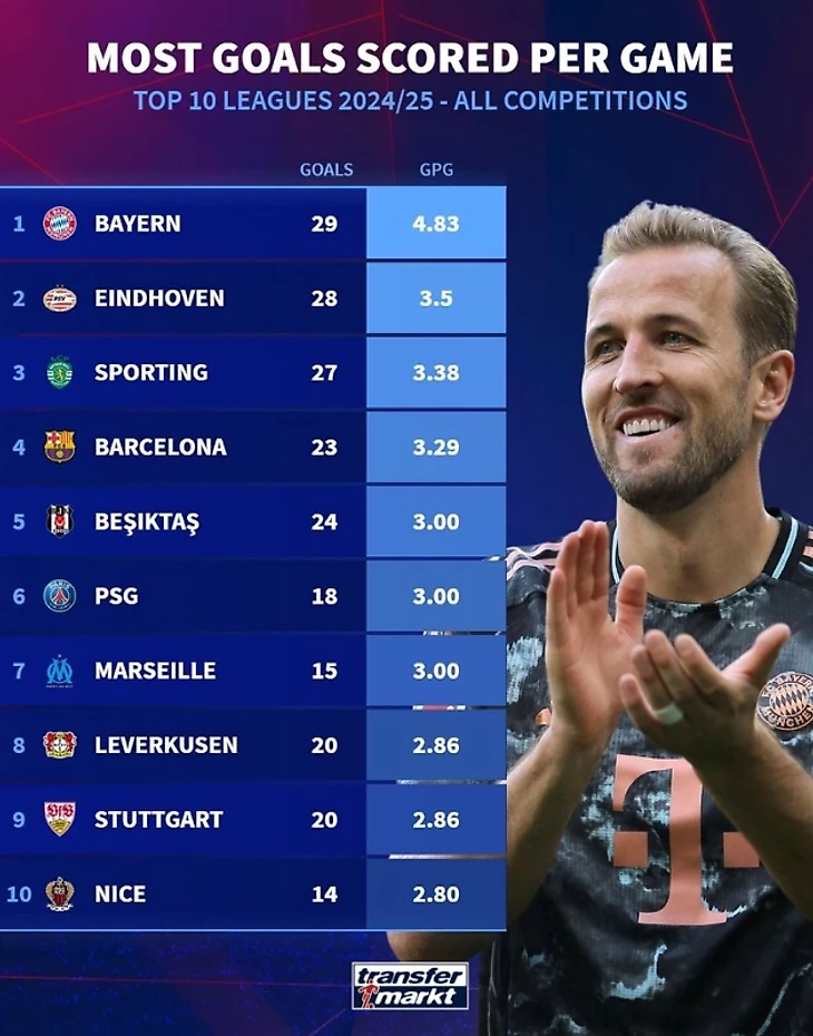Портал Transfermarkt выяснил, какие команды из топ-10 европейских лиг забивают чаще в среднем за матч. В расчет брались голы, забитые во всех турнирах.