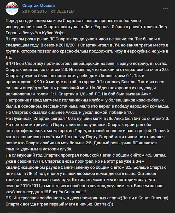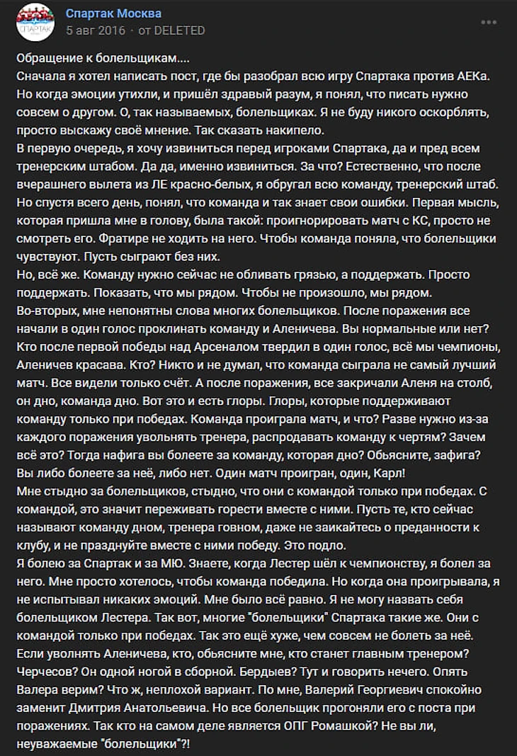 «Ты должен поддерживать свою команду до конца». «АЕК» - «Спартак». Ох..... Начиналось то всё неплохо. Не очень внятная игра, но 1:1 в гостях. Я ещё тогда стал модератором в одной из групп во ВКонтакте про «Спартак». . И написал первый в жизни пост о футболе.