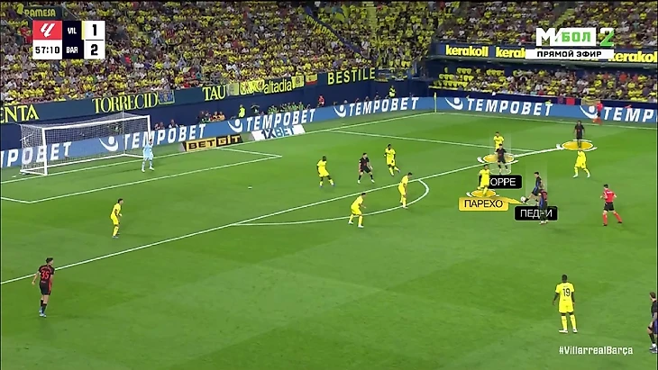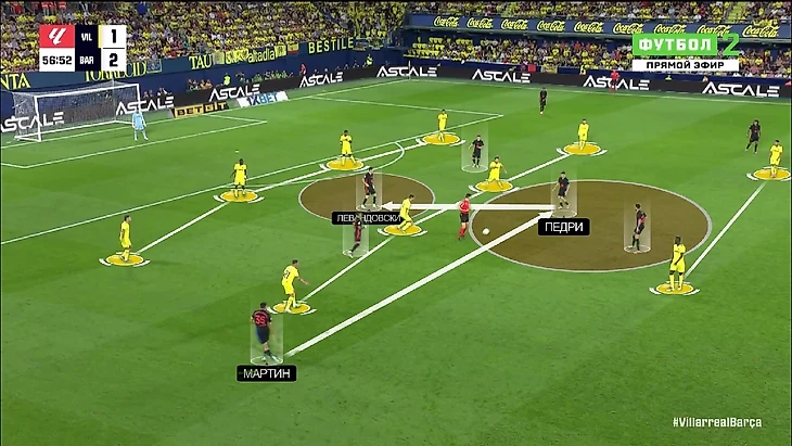 Еще один инструмент «Барсы» – переводы с фланга на фланг. Причина их эффективности – «Вильярреал» компактно закрывает центр, поэтому у защитников «Барсы», а также ближе к краям много свободы. Показательный пример – атака, которая привела к удару Ямаля в штангу. Начался эпизод с перевода Педри (с правого фланга, прошу заметить) на Иньиго Мартинеса: