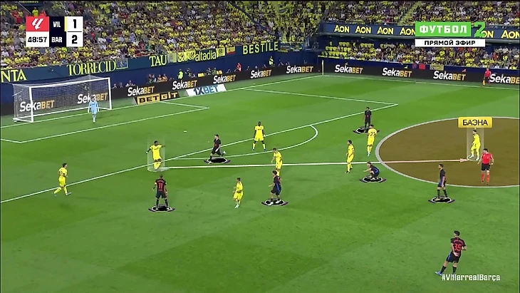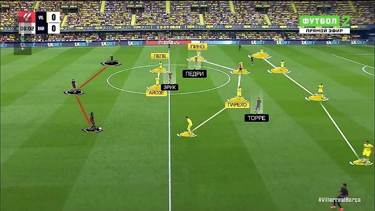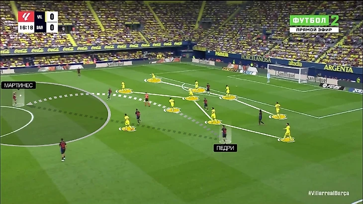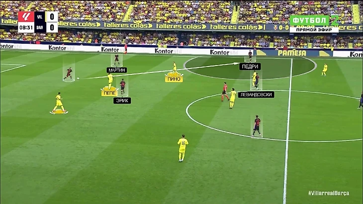 На стартовом отрезке «Вильярреал» не встречал «Барсу» высоко. Прессинг был точечным и не очень смелым, часто хозяева быстро переходили в средний блок в рамках 4-4-2. Центральные защитники гостей получили свободу, при этом полузащита «Барсы» была перекрыта: