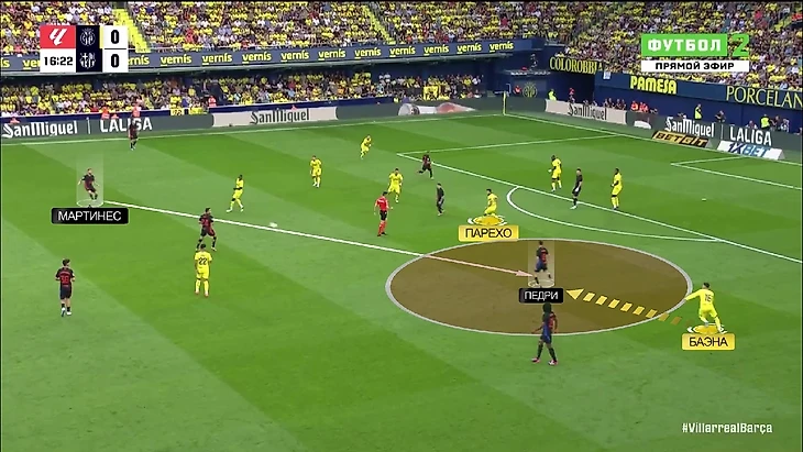 «Вильярреал» смещается, но в центре поля получает свободу Педри – Мартинес возвращает ему мяч, а Баэна не успевает накрыть: