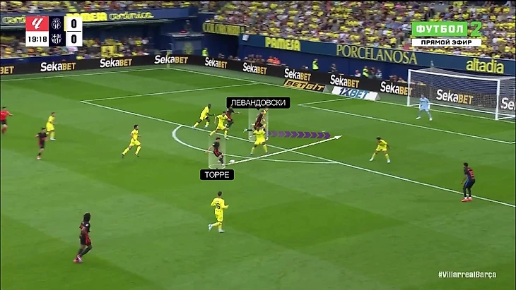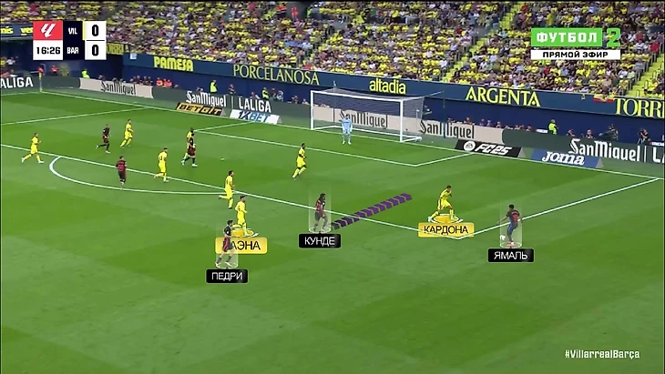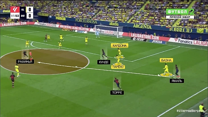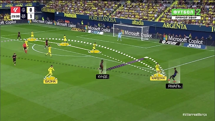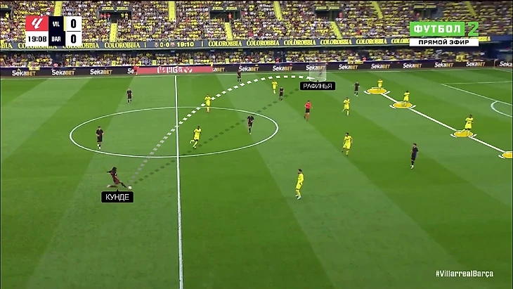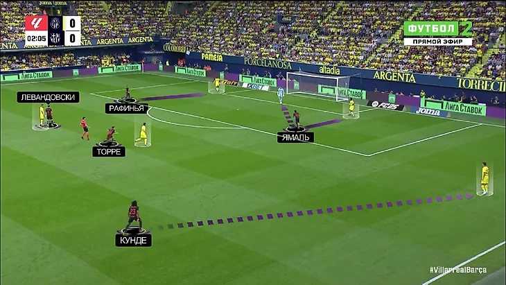 У «Вильярреала» тоже были свои инструменты. В первую очередь они связаны с прессингом «Барселоны» – категорически смелым и очень открытым во фланговых зонах. Он строился по абсолютно таким же принципам, как и в предыдущих матчах – Ямаль и Рафинья давят на ЦЗ, Левандовски и Торре перекрывают центр, а Кунде высоко выдвигается за крайним защитником соперника, поддерживая прессинг: