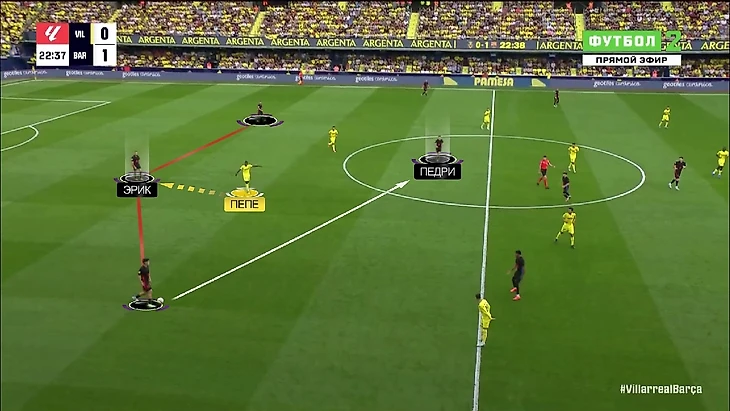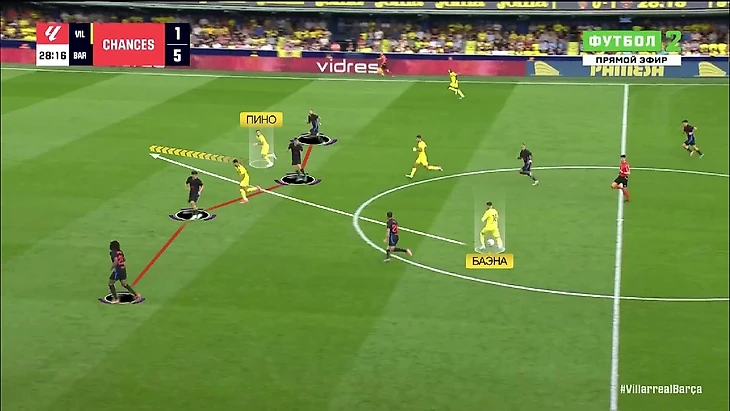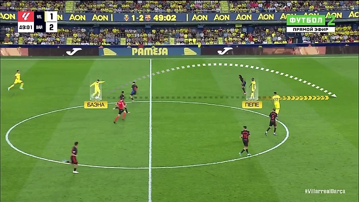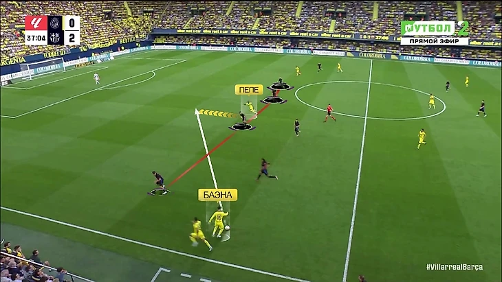 И тут в дело вступает связка Баэна – Пепе. Это довольно простой тип взаимодействия – Баэна один из лучших в чемпионате по разрешающим передачам, а Пепе может здорово открываться за спину и убегать. Еще чаще они наказывали в эпизодах, когда «Барса» не успевала накрывать контрпрессингом – да-да, в этом матче такое происходило частенько. Возможно это связано с тяжелым календарем каталонцев и усталость, но, так или иначе, «Вильярреал» за это мог наказывать, и не один раз.