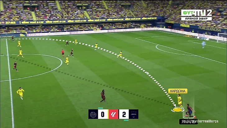 Ямаль получает мяч в идеальных для себя условиях: у Кардоны против него нет поддержки, поэтому можно пойти в дриблинг, при этом в штрафную без опеки снова вбегает Кунде, да и просто на удержание тоже можно сыграть: