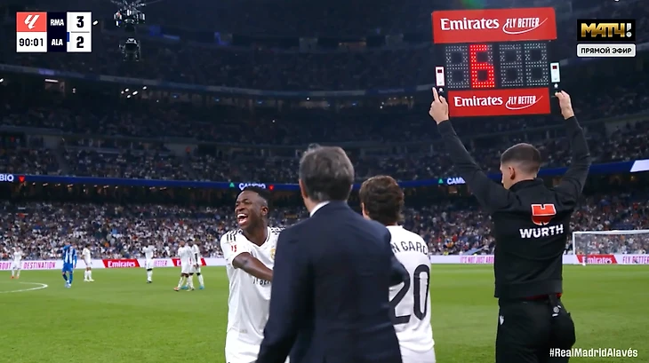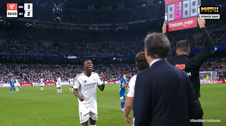 Вини заменили прямо в тот момент, когда резервный судья показал шесть добавленных минут на табло.