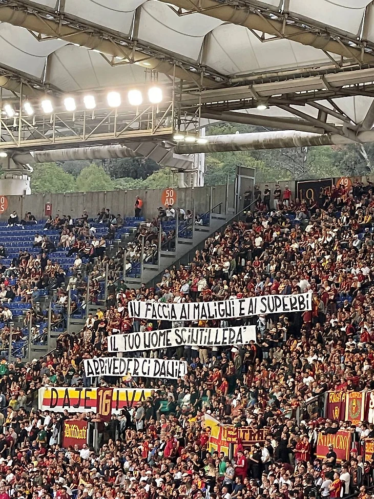 Параллельно с этим на противоположном конце стадиона фанаты заходили на Curva Sud. Буквально за несколько минут полностью пустая трибуна оказалась забита людьми. Тифози сразу начали заряжать: «Даниэле де Росси, Даниэле де Росси», и это подхватил весь стадион. Также в разных частях «Олимпико» то и дело появлялись текстовые баннеры, адресованные бывшему тренеру.
