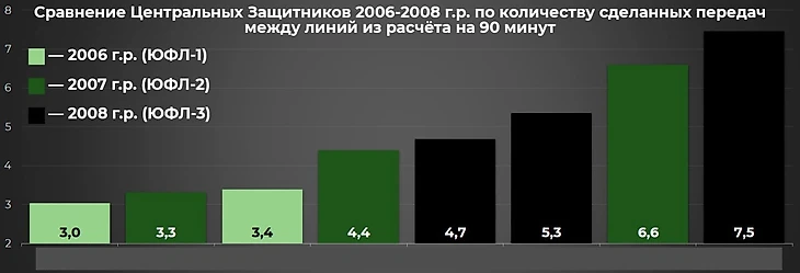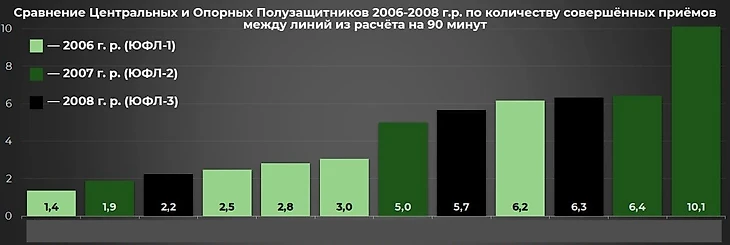 Таким образом формируется база данных данного амплуа по возрастам. После каждого сыгранного матча мы получаем данные, которые нам необходимы для проведения индивидуальных тренировок. Допустим у вас в академии есть что то похожее на футбот (очень полезная вещь) на нем можно смоделировать ситуации из игры, в которых наш инсайд должен играть определенным образом. Допустим, время приема мяча (первого касания) и совершения передачи (второе касание) не должно быть более 1,5 секунд. Почему 1,5 секунды? Ну это примерное значение которое мы можем получить из матчей.