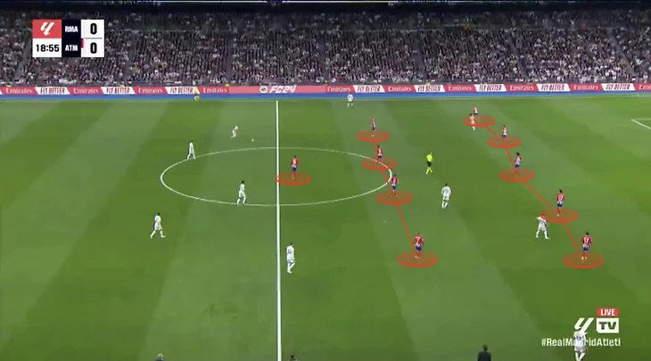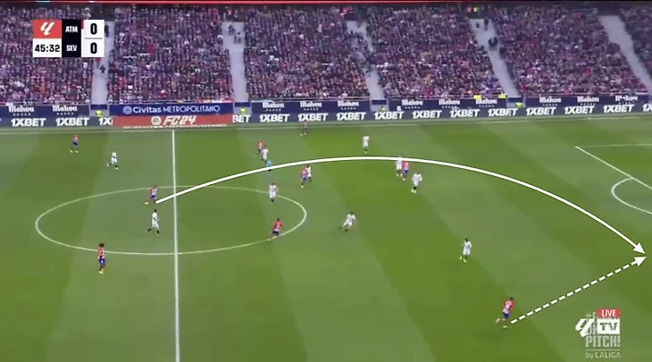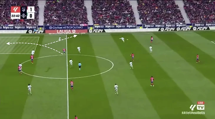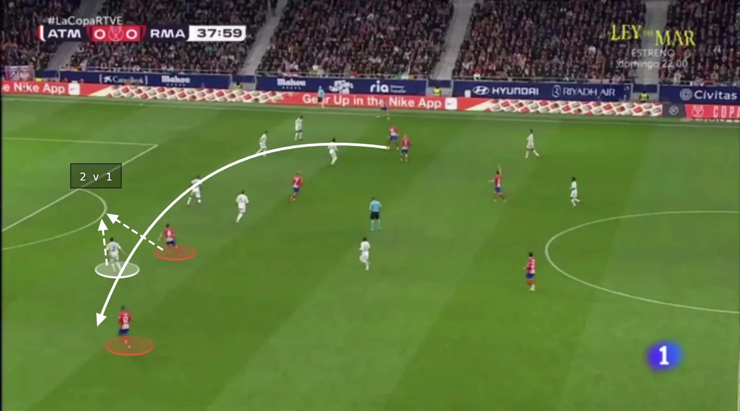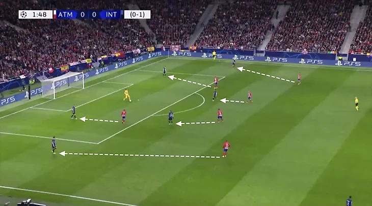 Это создает дилемму для крайнего защитника соперника: если он реагирует на движение вингера и идет за ним вглубь, то пространство позади него открывается, позволяя центральному защитнику «Атлетико» сделать пас вразрез атакующему полузащитнику. Однако, если он остается на своей позиции, чтобы прикрыть возможность забега полузащитника, мяч может быть передан вингеру «Атлетико», который уже будет готов атаковать оборону соперника лицом к воротам.