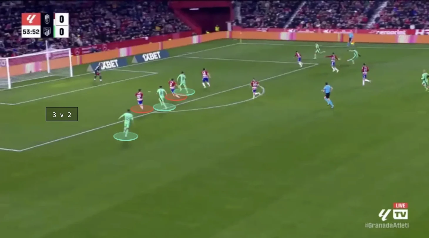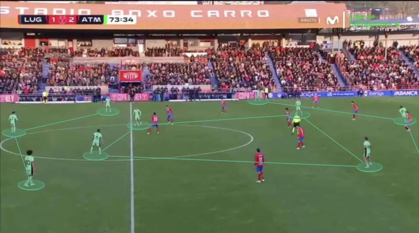 «Атлетико» также добивается численного преимущества с помощью перемещений между крайним нападающим и атакующим полузащитником. Когда мяч у широко расположенного центрального защитника, атакующий полузащитник поднимается наверх, в то время как вингер опускается, чтобы открыть линию паса.