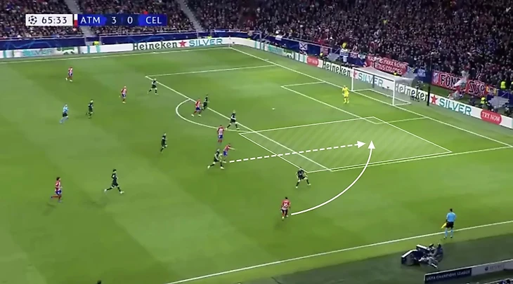 Еще одним важным аспектом игры «Атлетико» в финальной трети выступает наполнение штрафной площадки соперника большим количеством игроков: рывки в штрафную делают как полузащитники, так и крайние защитники, стремящиеся замкнуть подачу или прострел на дальнюю штангу.