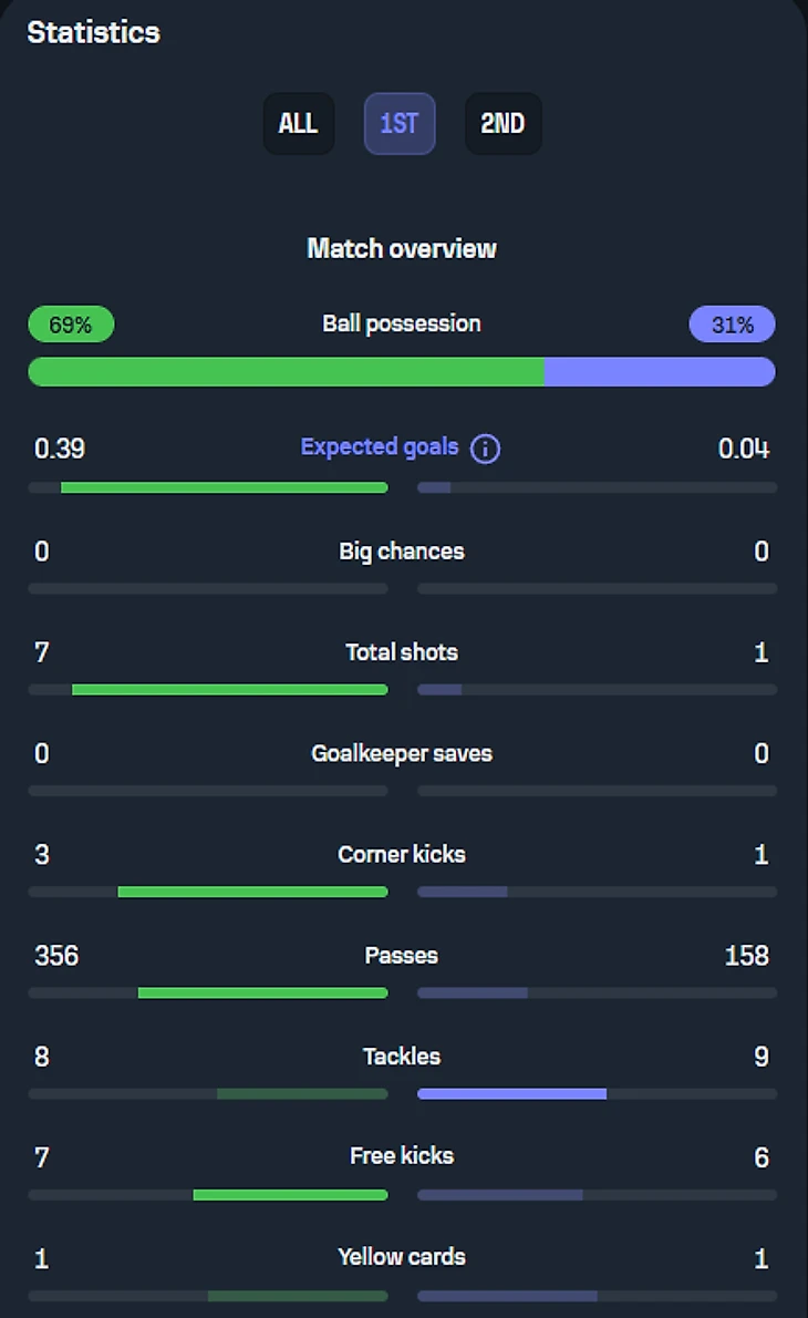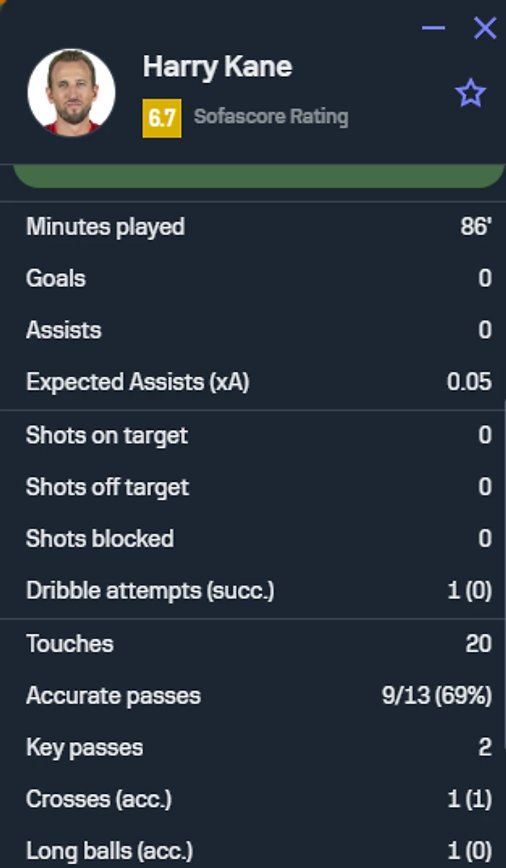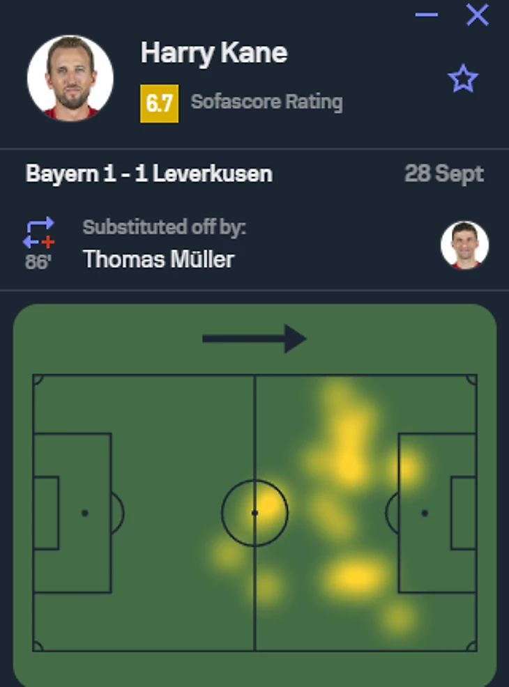 Если говорить в целом, то думаю всем очевидно, что 2 гола по такой игре - абсолютное чудо, на грани с покровительством высших сил Леверкузена, ведь не проиграть «Баварии» набрав меньше 0.1 xG, так еще и забив, сейчас может только «Байер». И основная установка Алонсо сегодня была очень схожа с типичной установкой Артеты на матч с «Сити» - максимально нейтрализовать соперника. И подопечные Хаби с этой задачей справились практически идеально, взять хотя бы игру Харри Кейна сегодня, которую мы уже вскользь затронули в предыдущем блоке. Немного статистики: