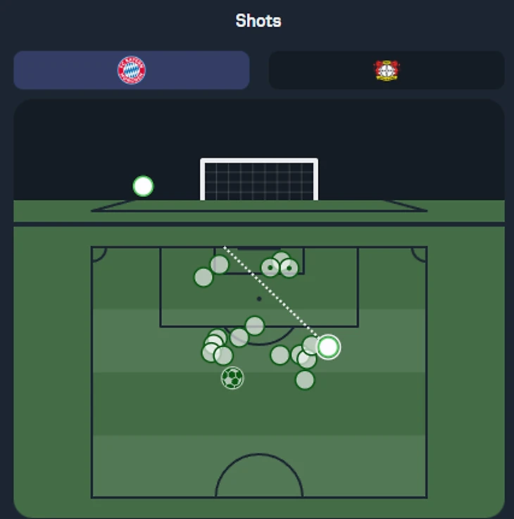Тепловая карта вообще выглядит как прифотошопленная от условного Кая Хаверца в его худший день на позиции форварда, но это реальность) Гости буквально выдавили главного форварда-завершителя в современном футболе из своей штрафной, из-за чего Харри иногда даже в центре поля оказывался, а в подыгрыше, он конечно хорош, но это отнюдь не его основная стезя. И именно такую шикарную установку по Кейну я считаю главным успехом «Байера» сегодня, ведь никому в Германии доселе не удавалось столь эффективно закрыть Харри. Еще предлагаю вам взглянуть на карту ударов Мюнхена сегодня, и в очередной раз убедиться в абсолютной успешности установки выдавливания «Баварии» из своей штрафной во что бы то ни стало: