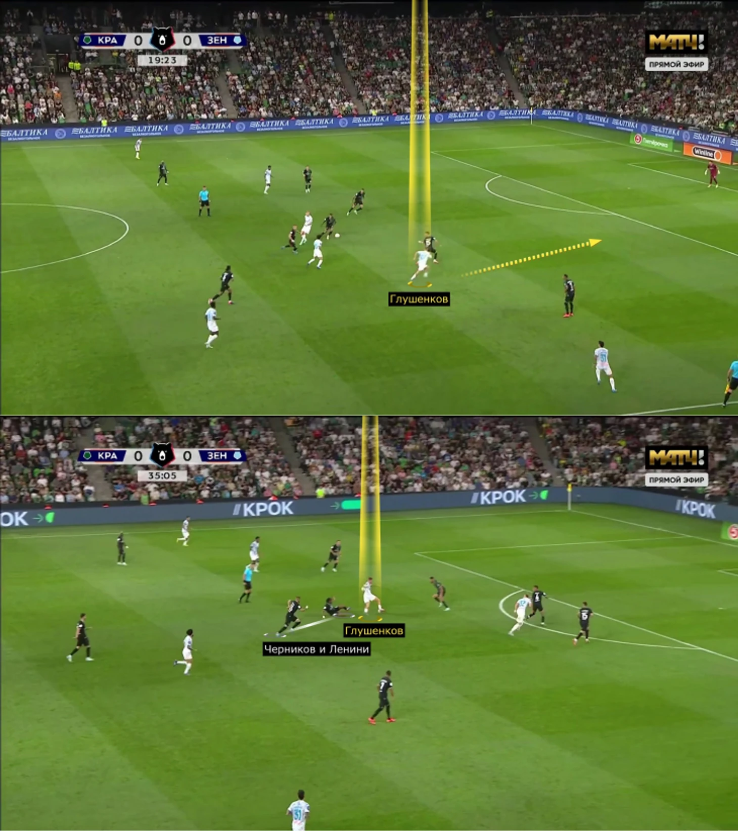 Сначала «Зенит» был легче и быстрее за счет возвращения Глушенкова. Затем «Краснодар» выровнял игру благодаря топ-перформансу Са и опасным штрафным Сперцяна. После перерыва «Зенит» запрессинговал и снова задавил на опорную зону с Глушенковым, Клаудиньо и Венделом. «Краснодар» тоже отодвинул прессингом.