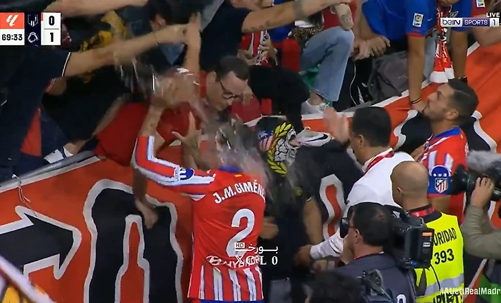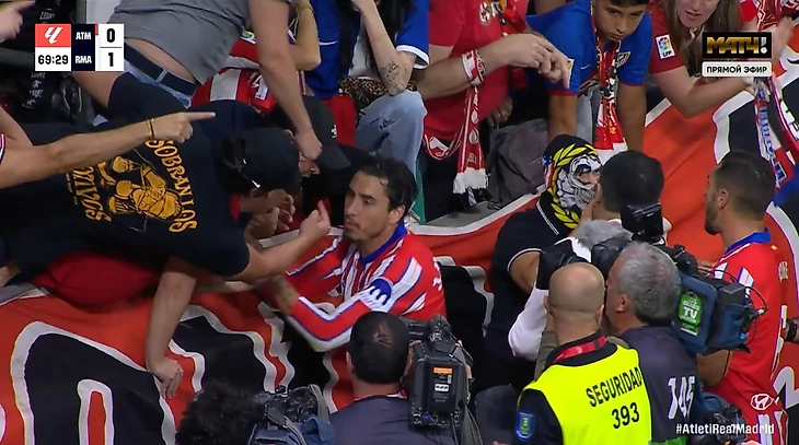 Мадридское дерби прервали из-за фанатов «Атлетико». В Куртуа прилетел пакет с чем-то странным, Хименеса облили, а Коке и Симеоне безуспешно успокаивали фанатов