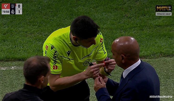 Судья Матео Бускетс поговорил с Карло Анчелотти и Диего Симеоне. Остановил матч на 10 минут.