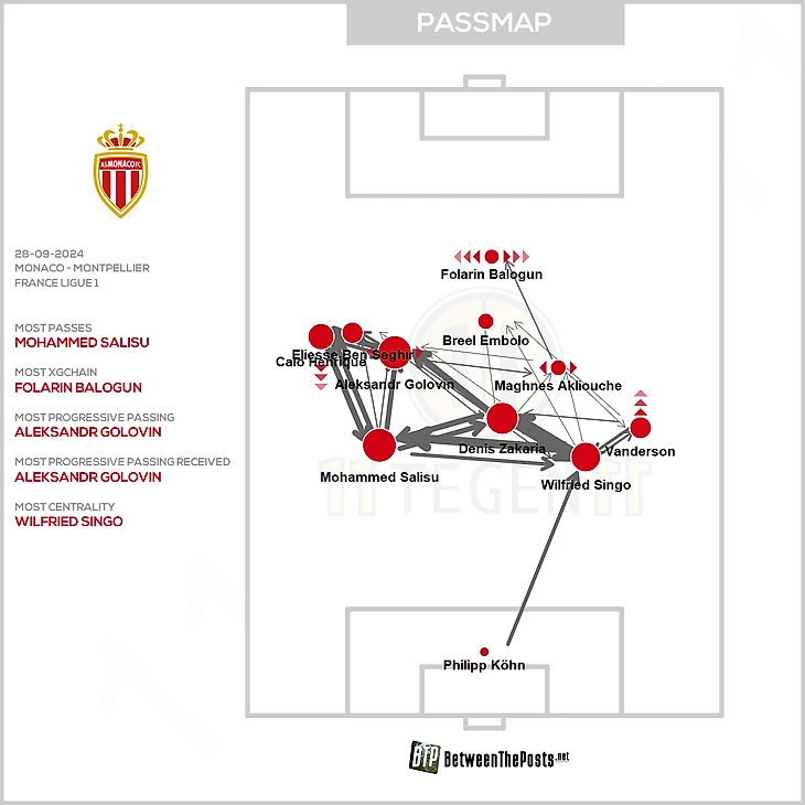 В матче против «Монпелье» Александр Головин стартовал в опорной зоне – рядом Денисом Закарией. Такой ход позволил Ади Хюттеру разместить еще больше атакующих игроков. Роль Головина с мячом была весьма свободной: мог участвовать в продвижении, а мог становится бонусной десяткой в чужой опорной. Александр закончил встречу лидером и по продвигающим пасам, и по полученным продвигающим.