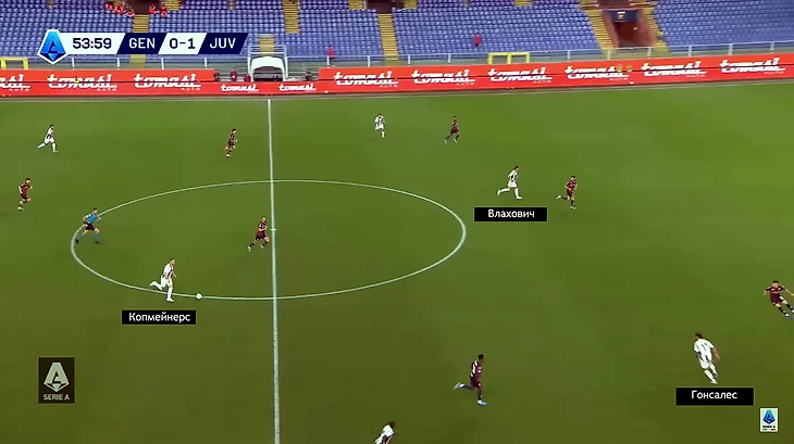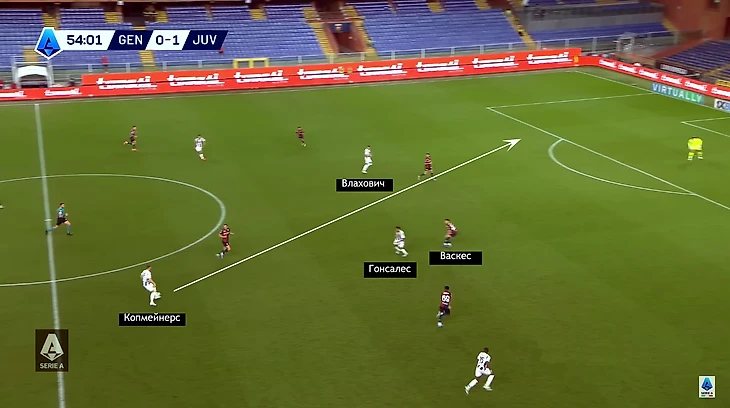Останься он там, и маневр был бы слишком жестким и предсказуемым. А центральный защитник, выбежавший на него, вернулся б в зону и подстраховал партнера против Влаховича. Но Нико сместился в центр. Васкес ушел за ним, на краю появилось пространство для рывка Калулу, а впереди – зона для забегания Влаховича. «Юве» ее использовал.