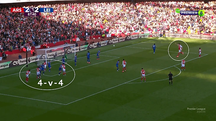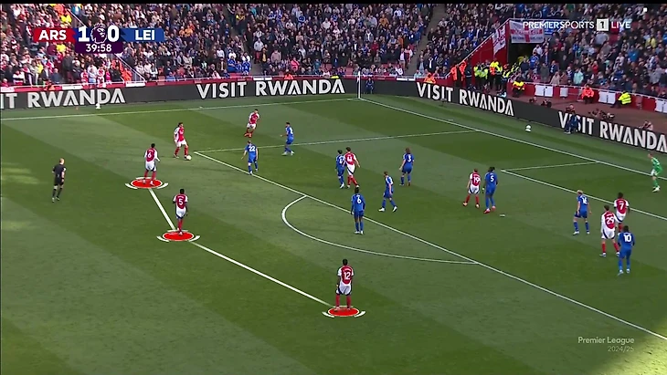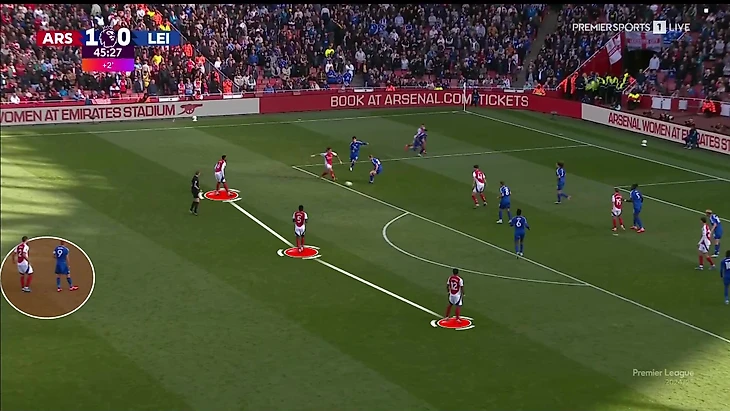 На чужой трети (из-за тактики «Лестера» это самая частая ситуация в матче) «Арсенал» задействовал блок Габриэл-Парти-Тимбер плюс шестерку игроков в еще более атакующих позициях: