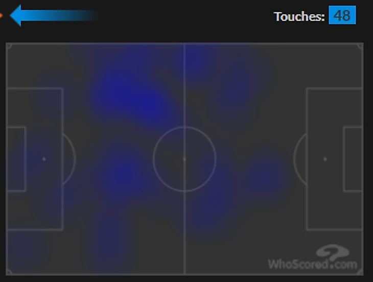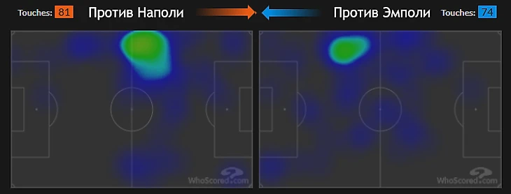 Как и в предыдущих матчах, Копмейнерс был центральной фигурой, но в концептуально ином воплощении: привлекал не мячи, а внимание. Это отразилось на всем: тепловая карта сдвинулась в центр, формальная (по количеству касаний) вовлеченность уменьшилась почти вдвое. Но впереди появилось пространство, идентичное с тем, которое создавала «Болонья»: голландец создавал зону либо для Влаховича, либо для крайка (как в последнем голе). Защита разрывалась.