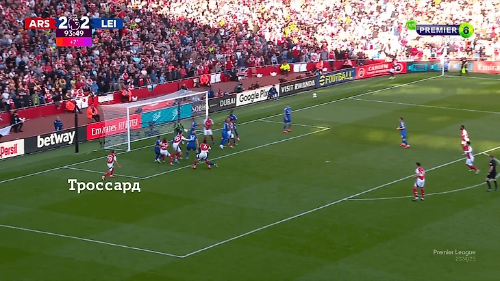 Изначально Троссард даже не заходил в штрафную на угловых – держался рядом с подающим на случай короткого розыгрыша. В концовке подал сигнал Букайо Сака, что теперь собирается на дальнюю.