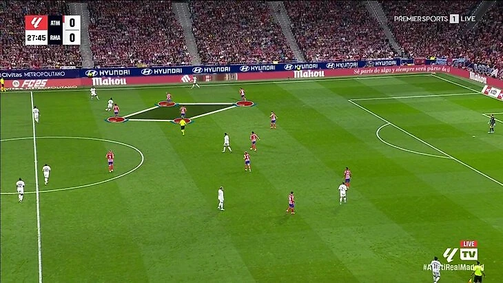 Грубо говоря, 4-4-2 дала плюс одного игрока на фланге по схеме, а динамичные игроки центра давали дополнительную подмогу. При необходимости присоединялся трудяга Гризманн. Получался вот такой капкан:
