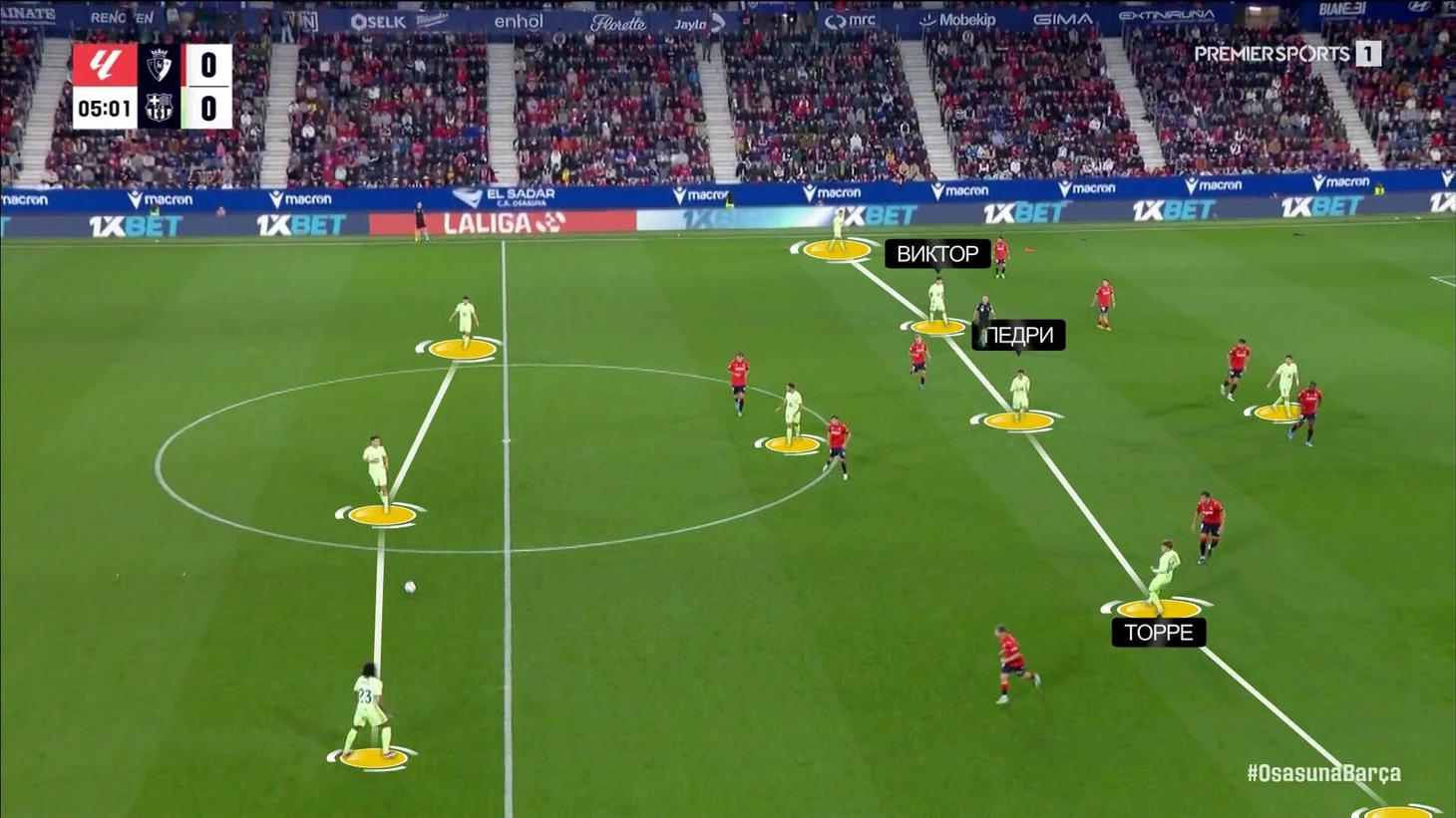 Второй фактор – стратегия «Осасуны». Команда не владела мячом, но стремилась держать высокую линию, за которую «Барселона» не могла наказать. При необходимости в эту линию защиты опускались вингеры, делая пятерку или даже шестерку. Но постоянным элементом было стремление ее завышать и не садиться в штрафную.