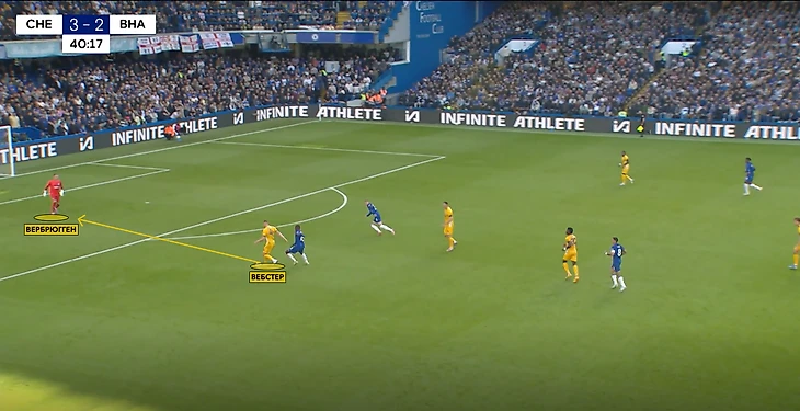 На 41-й минуте Вебстер снова оказался под прессингом форварда «Челси». На сей раз Адам отдал пас назад вратарю, которому пришлось выводить мяч через центр поля, где караулил Энцо.