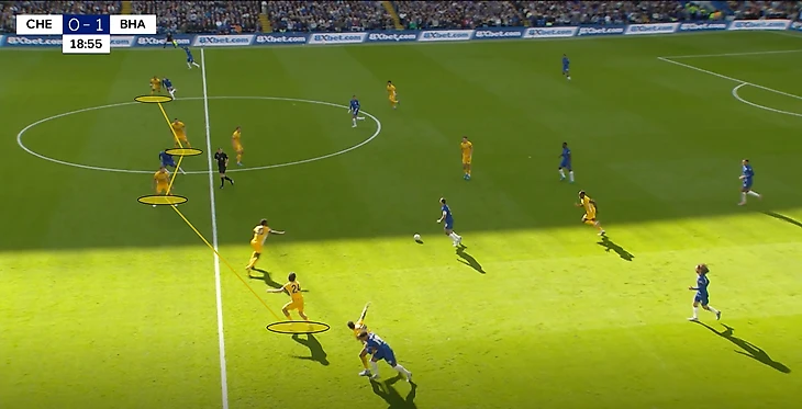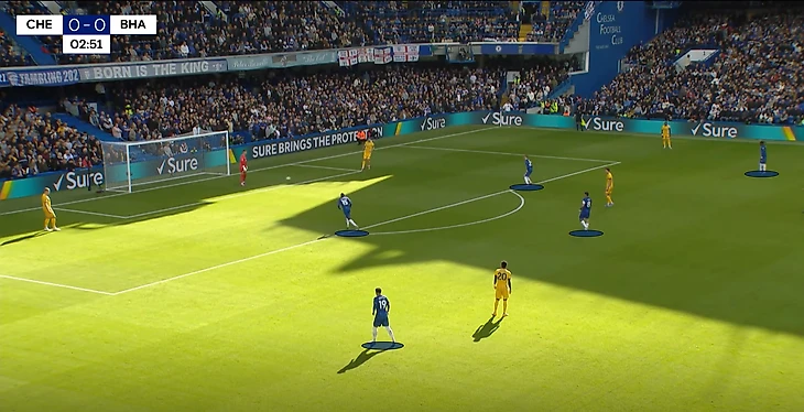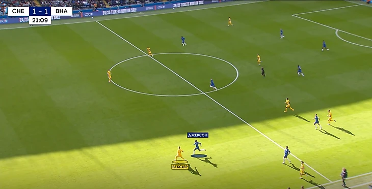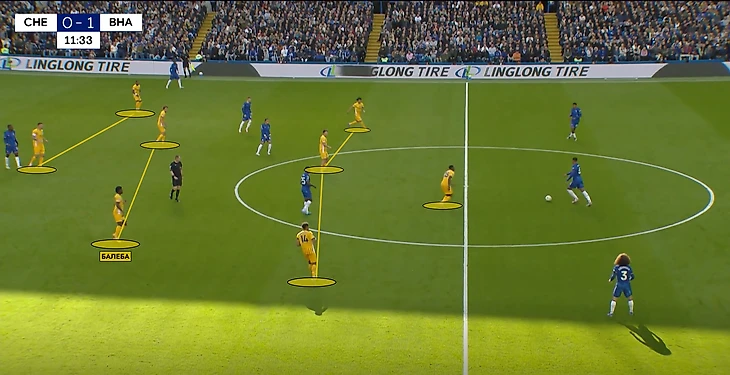 Структура защиты «Брайтона» также была нацелена на быстрый прессинг. На своей половине команда Хюрцелера выстраивалась в «4-2-3-1». В центре поля «Челси» имел явное численное преимущество 4 против 3. Другое дело, что «Брайтон» давал мало времени на позиционную атаку.