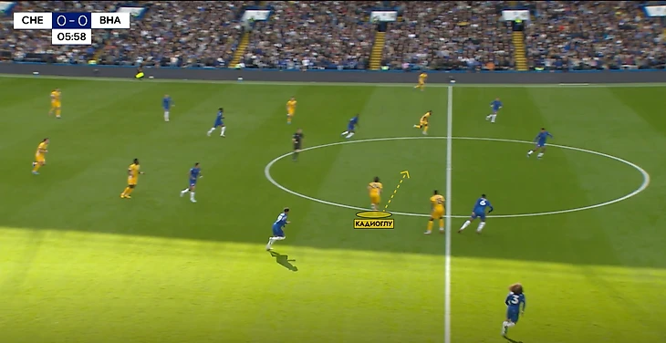Но уже на 7-й минуте «Брайтон» воспользовался своим преимуществом в центре поля. Адам Вебстер одной проникающей передачей отрезал переднюю и среднюю линию, оставив Кадыоглу одного в центре поля.