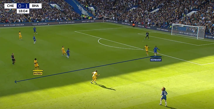 У такой идеи был недостаток – Балеба мог «застрять» в полупозиции, образовав коридор для передачи. Этим и воспользовался Левай Колвилл, отдав точный проникающий пас как раз в зону полузащитника «Брайтона».