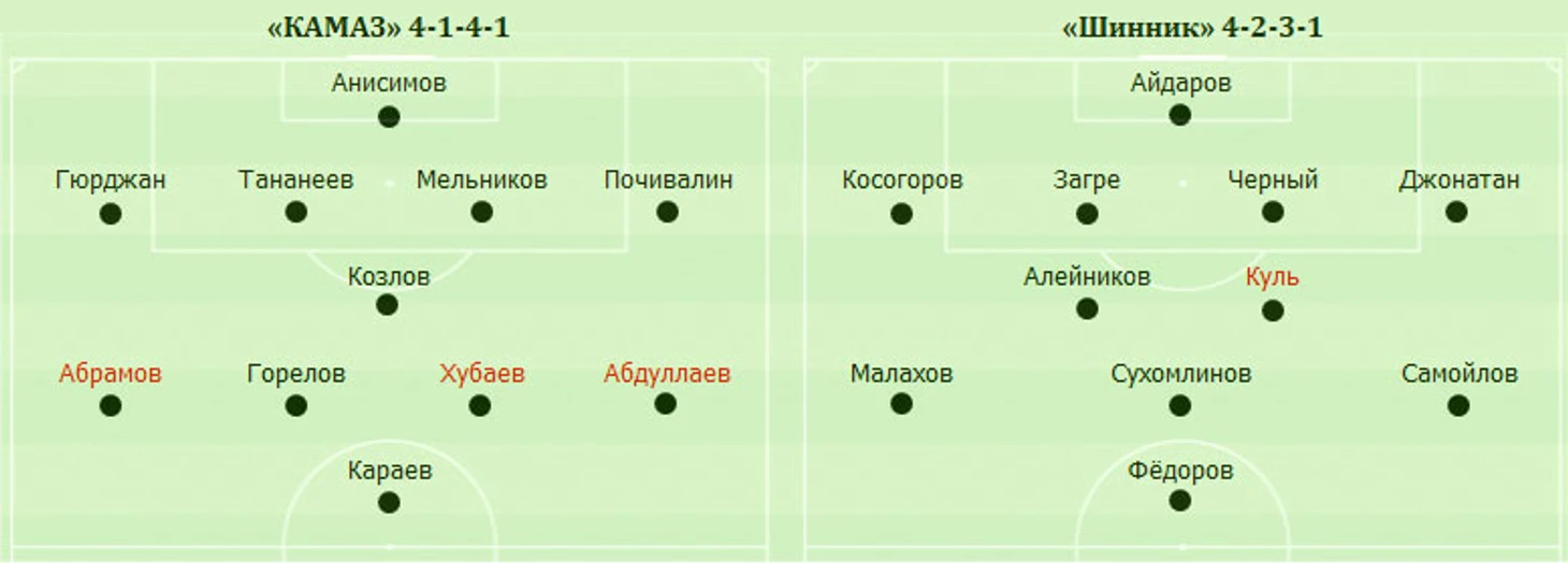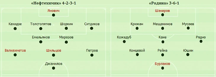 Наставник «Нефтехимика» Кирилл Новиков удивил тем, что отказался от любимой расстановки 4-4-2 в ромбом в центре поля, и его команда сыграла по схеме 4-2-3-1. С одним нападающим и двумя номинальными правыми защитниками – Кахидзе и Валиахметовым. Однако последний из них занял позицию справа в линии полузащиты.