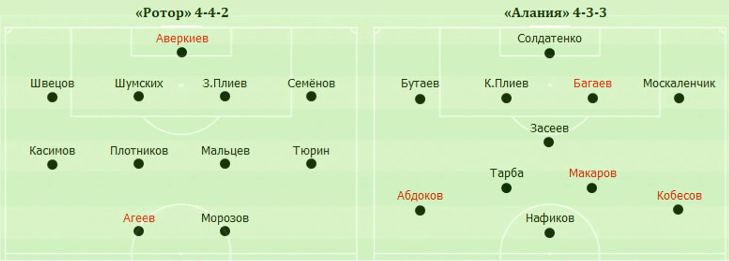 «Ротор» (Волгоград): Аверкиев, Семенов, Шумских, З.Плиев, Швецов, Плотников (Пяткин, 77), Касимов (Соколов, 69), Мальцев (Болотов, 68), Морозов (Лаврищев, 77), Тюрин, Агеев (Кухарчук, 62). «Алания» (Владикавказ): Солдатенко, Бутаев, Багаев, К.Плиев, Москаленчик, Засеев (Губиев, 46), Макаров (Цаллагов, 47), Тарба, Кобесов (Хадарцев, 53), Абдоков (Чочиев, 80), Нафиков (Хугаев, 67). Наказания: Шумских, 77. Семенов, 89. Болотов, 90+1. Прищепа, 90+1. Бутаев, 90+1 (предупреждения). Судья: Зияков (Набережные Челны). 30 сентября. Волгоград. Стадион «Волгоград Арена». 15 407 зрителей.