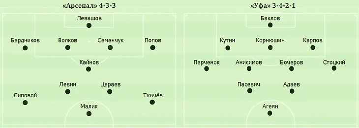 «Арсенал» (Тула): Левашов, Бердников (Коротков, 82), Волков, Семенчук, Попов (Жилкин, 57), Кайнов, Липовой (Гелоян, 46), Левин, Цараев, Ткачев (Азявин, 82), Одейинка (Турищев, 62). «Уфа»: Баклов, Стоцкий, Корнюшин, Кутин, Карпов, Бочеров, Анисимов, Перченок, Адаев (Исаев, 80), Пасевич (Ложкин, 80), Агеян (Теняев, 90+4). Наказания: Волков, 18. Попов, 35. Левин, 87. Анисимов, 90+2 (предупреждения). Судья: Соколов (Воронеж). 29 сентября. Тула. Стадион «Арсенал». 4890 зрителей.