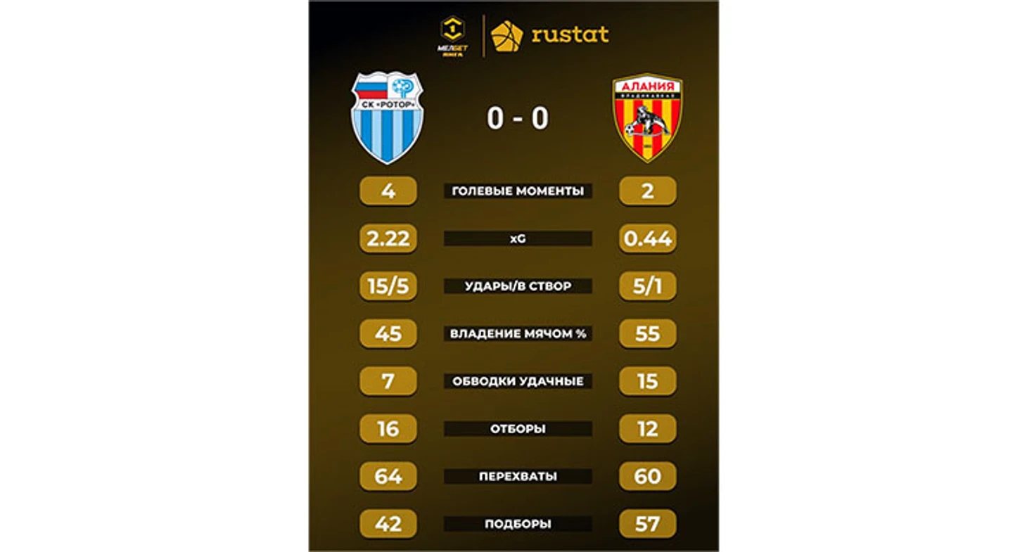 Какого результата, кроме 0:0, можно было ожидать от двух команд со столь низкой результативностью? «Алания» - худший клуб лиги по данному показателю, «Ротор» - пятый с конца. К сожалению, предматчевый прогноз оправдался. Хотя поводов не сбыться у него было предостаточно! xG тому свидетель.