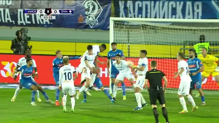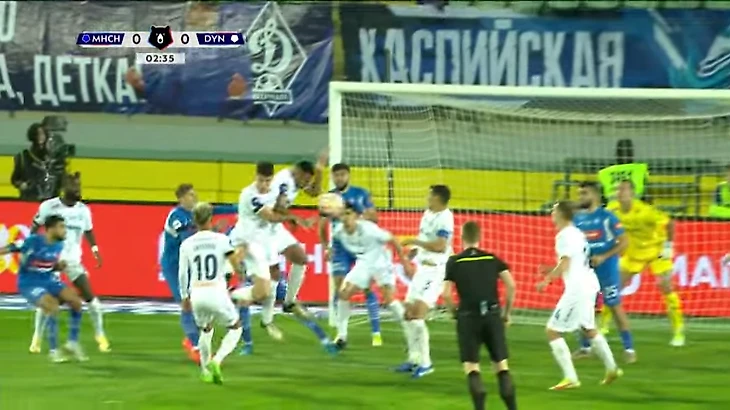 Где тут повод для пенальти - непонятно в принципе: до штрафной метра полтора. Теперь рассмотрим момент с точки зрения КК за «лишение явной возможности забить гол». Как минимум 1 защитник «синих» ближе к воротам, чем Роналдо, и этого в принципе достаточно, чтобы закончить спор - при невыполнении хотя бы одного из критериев, описанных выше (при удалении Гогуа) выносится предупреждение за «срыв перспективной атаки». Почему Карасев не показал ЖК? Посмотрите еще один момент - уже из второго тайма с фолом уже на игроке Динамо в этом же месте поля