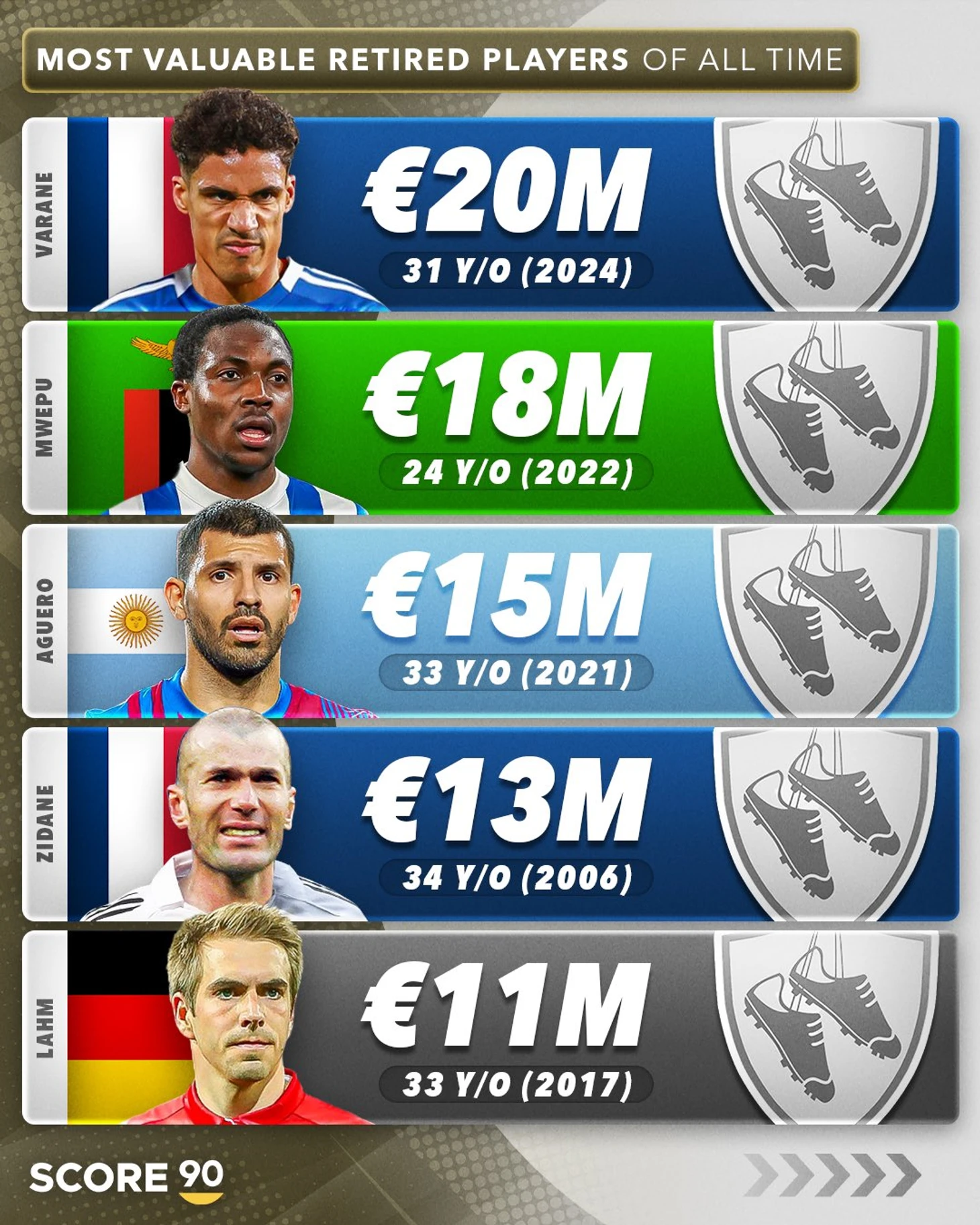На первом месте среди самых дорогостоящих «пенсионеров» расположился Рафаэль Варан. Француз объявил о своем уходе из профессионального футбола в этом месяце, будучи игроком итальянского «Комо». На момент принятия решения трансферная стоимость 31-летнего Рафы составляла 20 млн евро.
