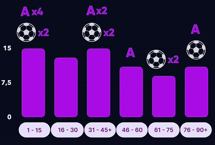 Интервально у Батракова два пика активности – начало и конец первой половины матчей. Но, именно стартовые 15 минут являются игровым отрезком с наибольшим количеством результативных действий футболиста.