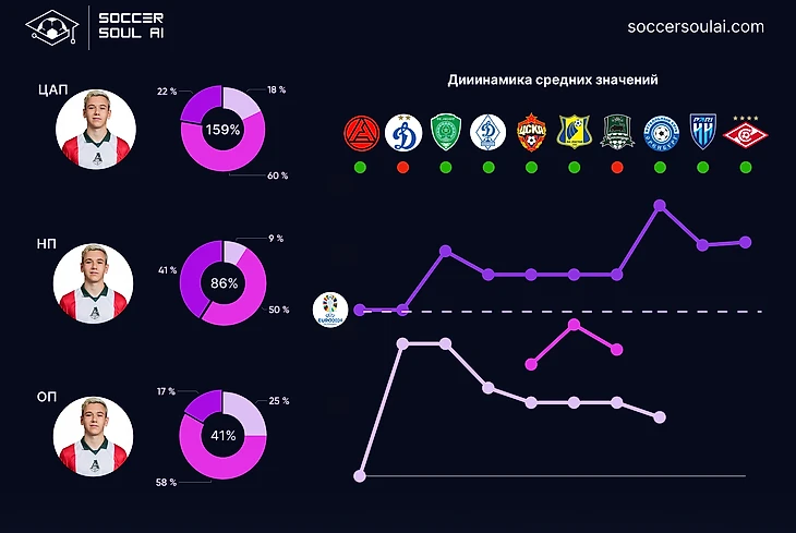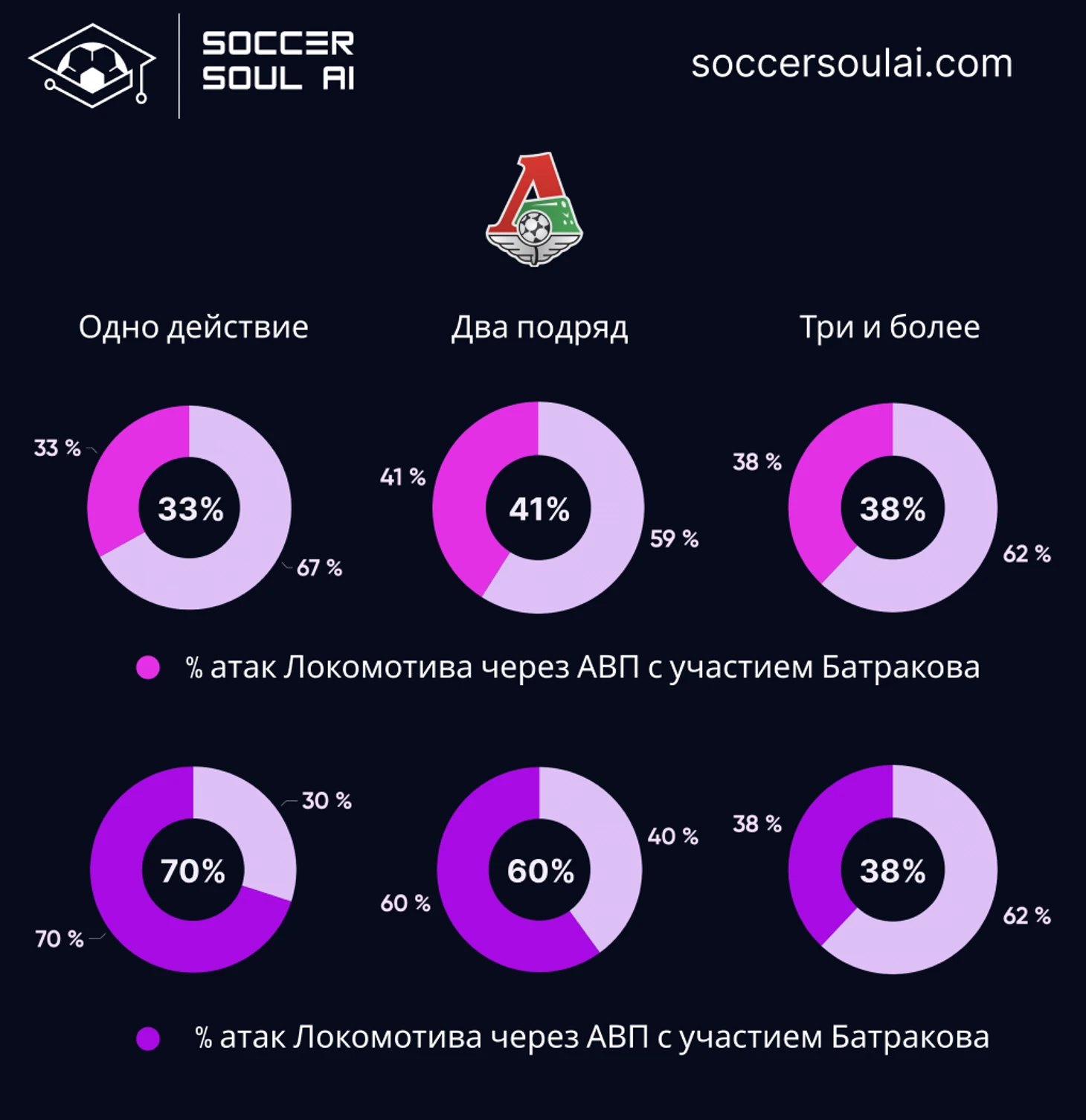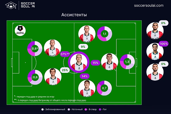 В среднем за матч Батраков участвует в семи АВП-комбинациях (32% от всех командных) из которых более одной приводят к голу.
