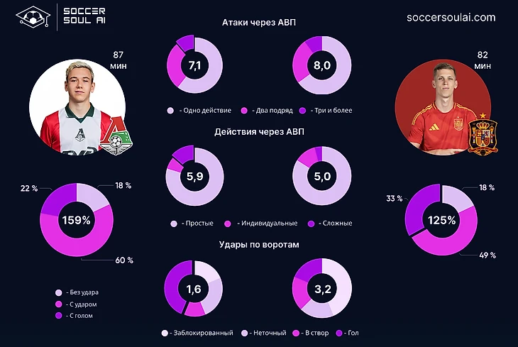 При этом он участвует в 60% голевых атак с двумя АВП-действиями подряд и в 70% с одним успешным действием. Способность решать эпизод, отдавая одиночную передачу под удар, либо результативно завершать атаку после подобной передачи – важный игровой навык, помогающий вскрывать оборонительные построения соперников при позиционной атаке. В футболе не так много игроков, сочетающих в себе две эти функции одновременно.