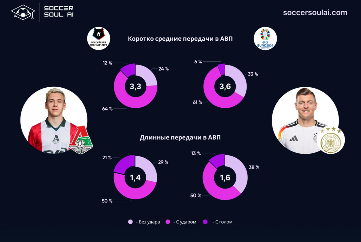 Прекрасное использование коротко-средних и длинных передач Батраковым подтверждает и заочное сравнении с главным специалистом по простым игровым элементам – Тони Кроосом. Показатели немецкого игрока базируются на матчах за сборную на прошедшем чемпионате Европы. Батраков уступает количественно, но лучше смотрится с точки зрения эффективности и результативности действий.