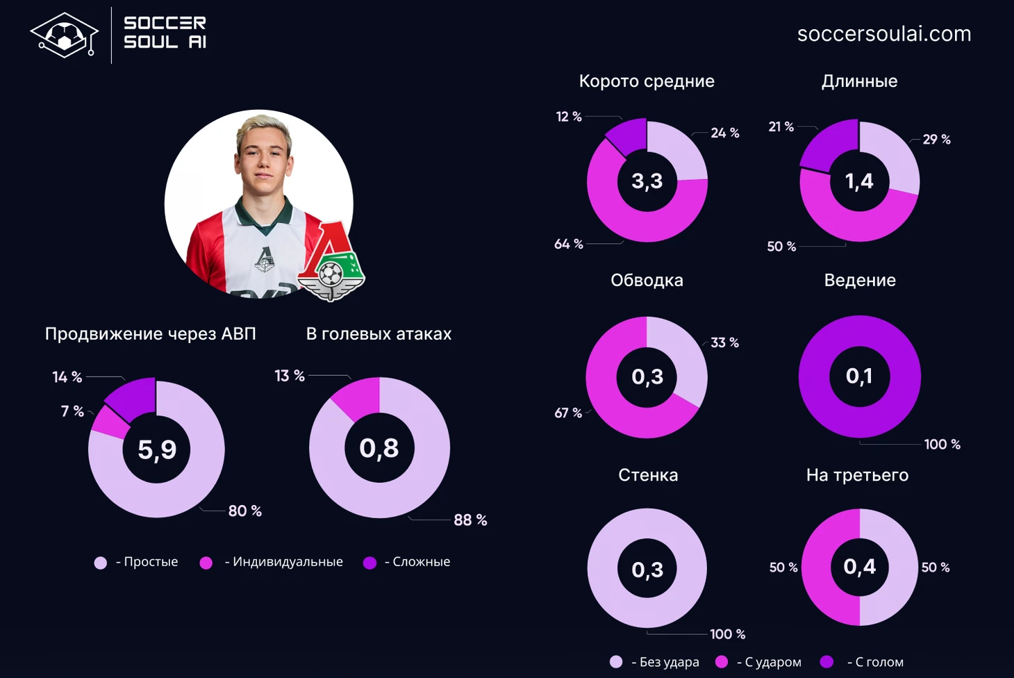 Доли результативных коротко-средних и длинных передач подтверждают факт максимальной полезности для команды простых игровых действий в исполнении Батракова;