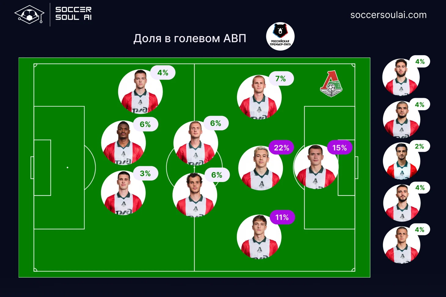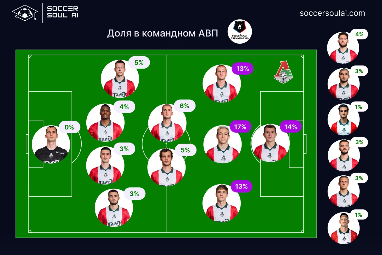 В 9 из 10 матчей Локомотив имел сумму АВП-баллов больше, чем у соперников, в половине случаев она превышала 20,0 баллов, а в шести играх была выше средней нормы 17,3. Посмотрим, кто формирует командный АПВ-показатель. Логично, что хит-парад возглавляет атакующая линия – по 13% дают фланги в лице Пиняева и Самошникова, 14% командных АВП-баллов на счету Воробьёва, а лидер команды по этому показателю – Батраков (17%).